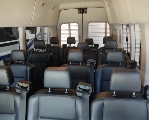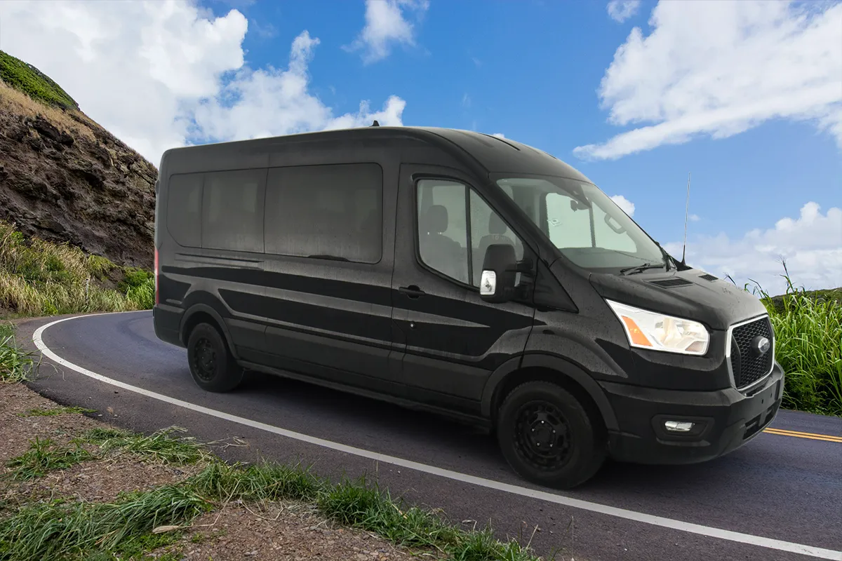 Choose our luxury ford transit vans for premium fleets that are an excellent choice for group or business travel. We offer late-model vehicles with comfortable seating, air-conditioned leather interiors, dark-tinted windows for a quiet ride, and tremendous value for larger groups. This popular choice for rentals boasts spaciousness, versatility, and modern features to meet all group travel needs, including ample cargo space, touchscreen displays, and Bluetooth connectivity. It accommodates large passenger vans in 14-passenger configurations with flexible seating arrangements, like split seating in second and third rows for customizable layouts. With ample headroom in its class for comfortable entry and exit, adaptable space even with 14 passengers and luggage, entertainment options to enhance driving, and convenience features like rear-view cameras and blind-spot monitoring, maneuvering is easier. Safety is top-tier with standard accident prevention systems, automatic braking, post-collision braking, available all-wheel drive for enhanced traction, USB ports, and AC outlets.